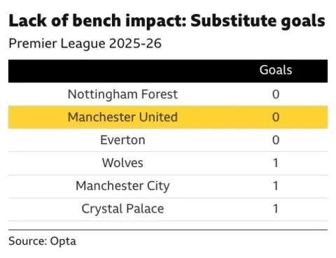 本賽季至今,曼聯(lián)的替補(bǔ)球員在英超聯(lián)賽的進(jìn)球?yàn)?